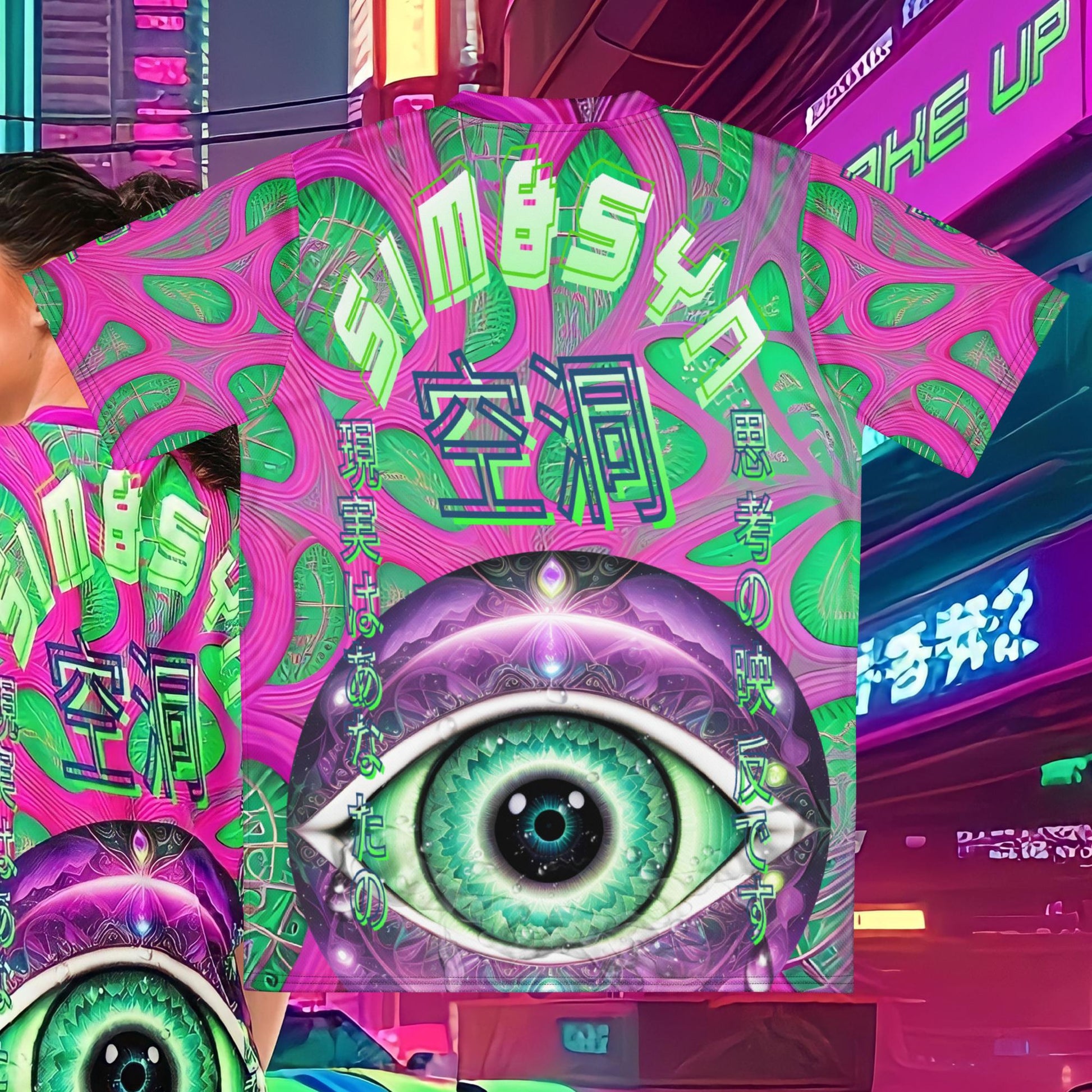 Dive deep into the realms of the cosmos with our "Cosmic Visionary Shirt". This shirt encapsulates the duality of the universe, with its all-seeing eye that sheds crystalline tears, representing the profound sonder evoked by the vastness of space. A kaleidoscope of ethereal pink and neon green illuminates the intricate Japanese moji, offering a visual feast for the soul. Designed not only for its aesthetic appeal but also for ultimate comfort, it's perfect for those looking to make a bold statement and step into the future. Crafted from 100% recycled polyester fabric, this shirt promises breathability and efficient moisture-wicking capabilities. With its two-way stretch fabric, expect maximum mobility and comfort. Plus, it's designed with UPF50+ protection to shield you from harmful UV rays. The double-layered v-neck collar adds a touch of premium elegance. Wear it, flaunt it, and resonate with the vibrant energies of the universe! 🌌🚀🌟Materials sourced in China.