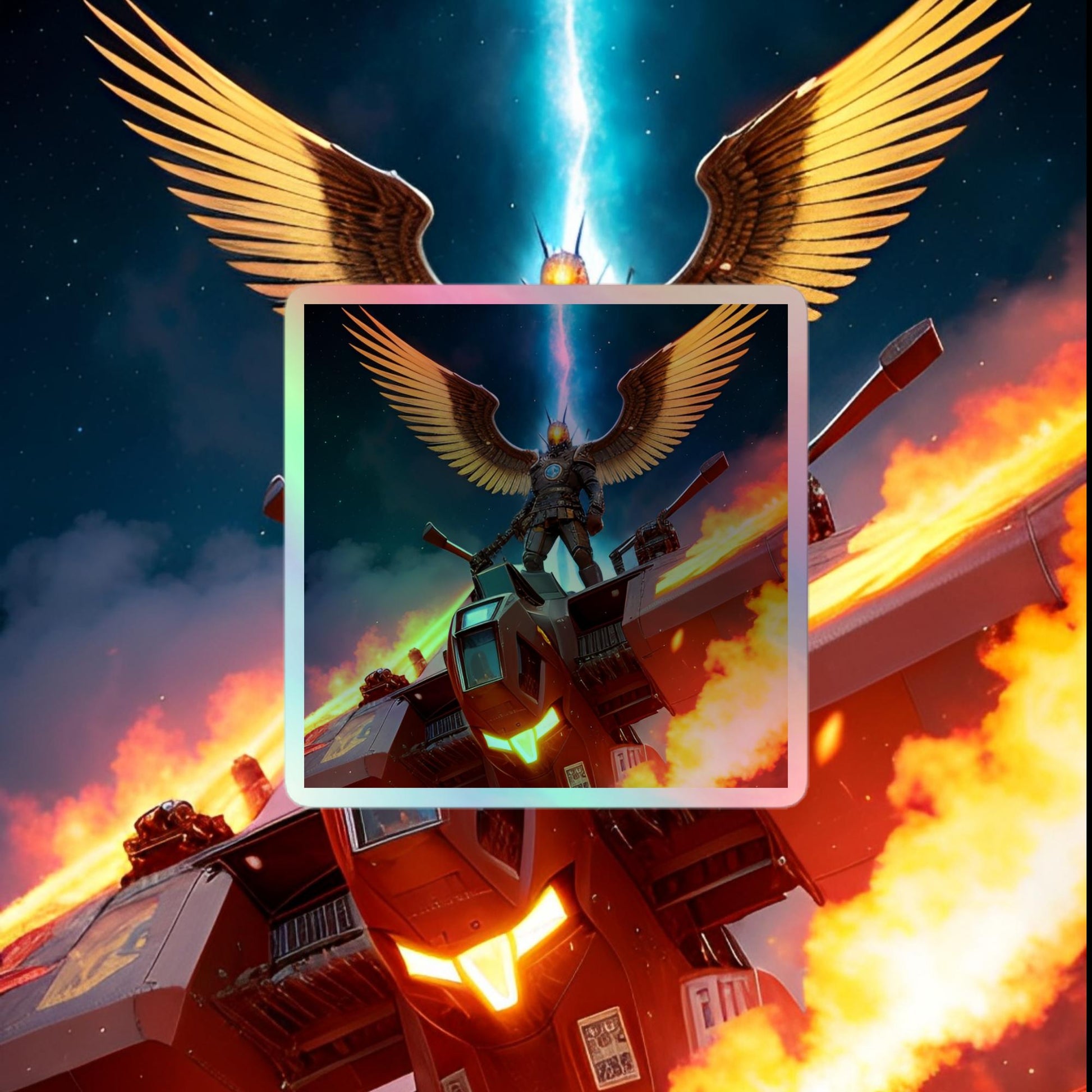 Seraph is captured in a defining moment, standing atop a falling aircraft, its spiraling descent juxtaposed against their poised majesty. The backdrop is electrified by a violent strike of lightning, painting a tapestry that is as chaotic as it is beautiful. Amidst all this, Seraph stands unyielding—a harbinger of a future yet unknown, a sentinel at the nexus of human ingenuity and the unbounded potential of technology.